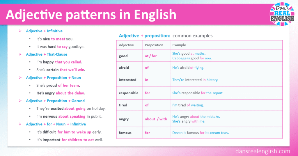 In this free English grammar lesson, I’ll show you how to use common adjective patterns in English, with examples and exercises.